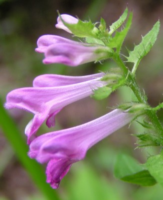 ・茎先に長さ3〜10cmの花序を出し、紅紫色の唇形の花をつける。上唇はカブト状、下唇は3浅裂し、中央に白い斑紋が2個ある。