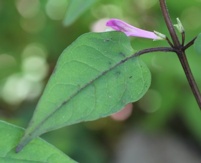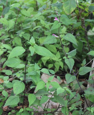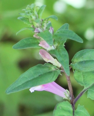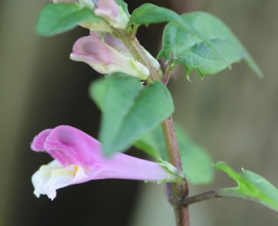 ・上部の葉腋か、茎先に長さ5cmほどの花序をつくり、紅紫色の唇形の花をつける。花冠内部に黄色の斑点がある。