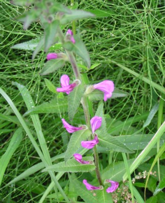 ・茎の上部に長さ2pほどの紅紫色の花をつける。花は2唇に分かれ、上唇は嘴状に尖り、下唇は先端が浅く3つに裂ける。