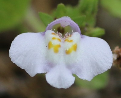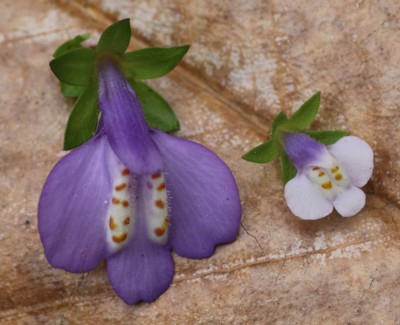 ・花は長さ約1cm、上唇は紫色、下唇はわずかに紫色を帯びた白色で、黄色と赤褐色の斑紋がある。
