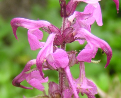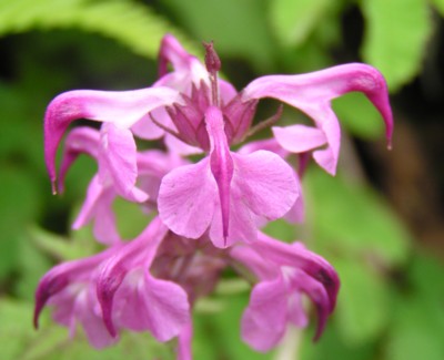 ・花は紅紫色で、茎先に4個ずつ数段輪生する。花冠は2唇形で、上唇は鋭い嘴状になって下に曲がる。