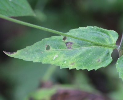 ・葉は対生し、長さ7〜10cm、幅4〜7cmの卵形〜長楕円形で粗い鋸歯がある。