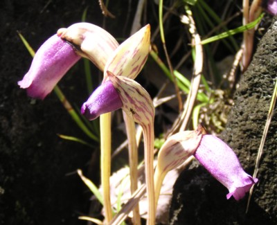 茎はほとんど地上に出ない、茎のように見えるのは花柄。山地に生え、本種に良く似た大型のを「オオナンバンギセル(A.