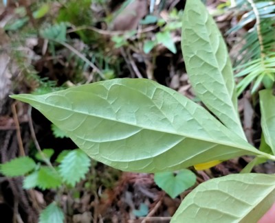 ・葉は互生、長さ8〜15cmの倒卵状楕円形〜長楕円形、全縁で先は尖る。