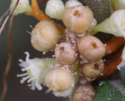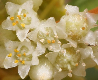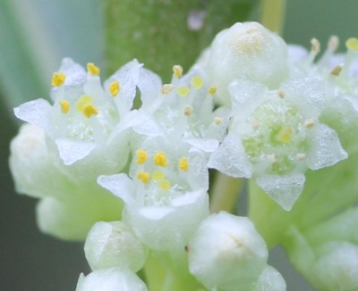 ・花冠は白色で直径約3o、かたまってつく。雄しべは5個、花柱は2個。