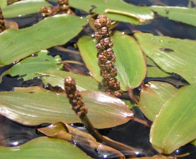 ・浮葉は長さ5〜13cm、幅3〜5cm、表面は濃緑色からやや赤みがかった色で光沢がある。