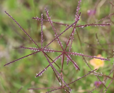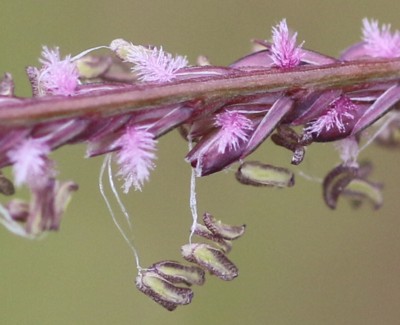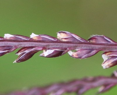 | ・小穂は長さ2〜3mmで淡緑色、ときに赤紫色を帯び、枝の片側に2列に並んでつく。 |
