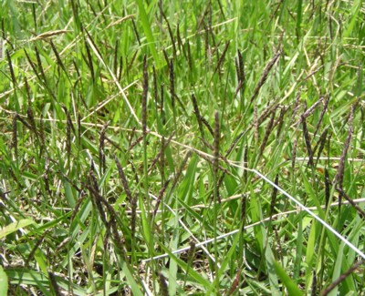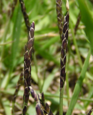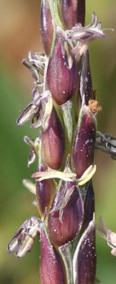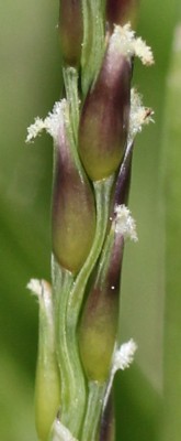 ・花茎を節から出し、長さ3〜5cm、幅4〜5mmの円柱状の花序をつける。花序は紫色を帯びて、小穂は長さ約3mm、幅約1.5mmの狭卵形。