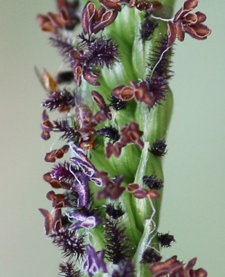・小穂は、長さ約3mmの広卵形〜楕円形で先がとがり、ふちには軟毛がある。花序の枝の片側に3〜4列に密生する。