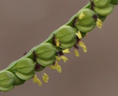 ・小穂は、長さ約2.5mmで広楕円形をして、花序の枝の片側に2列に密生する。