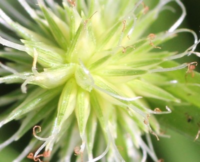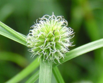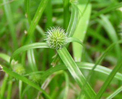 ・茎先に葉と同じような苞が2〜3個あり、その間に直径1pほどの球形の花序を1個つける。