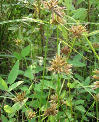 ・茎先に葉と同じような苞が3〜5個あり、その間に球形の花序をつける。