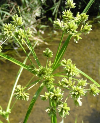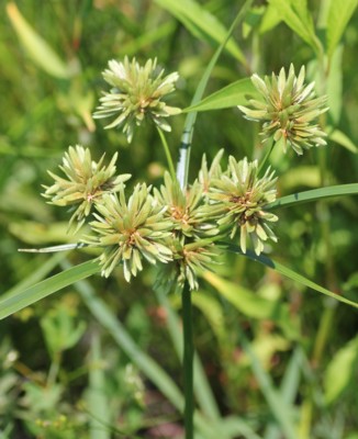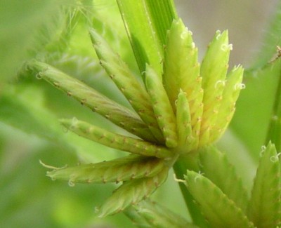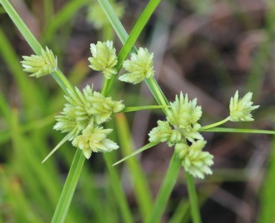 | ・茎先に葉と同じような苞を4〜7個つけ、その間から数個から十個以上の枝を出して球形の小穂をつける。 |