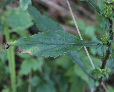 ・根生葉はふつう花期には枯れる。茎葉は長さ7〜9cmの卵形〜卵状楕円形。