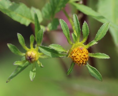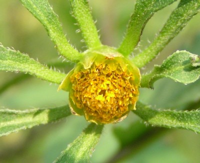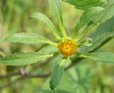 ・頭花は黄色で、上部の枝先に一つずつつけ、小さい舌状花がある。総苞片は6〜12個、葉のように見え頭花を囲む。
