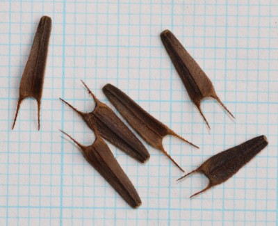 | ・果実は痩果。扁平で長さ6〜7mm、先端に芒状の冠毛が2個ある。 |