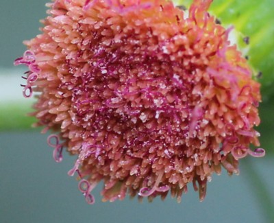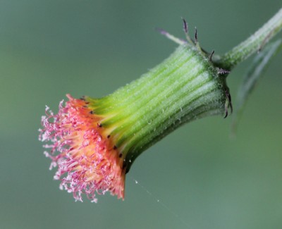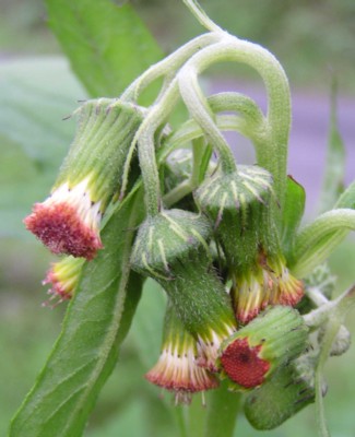 ・花序は先が垂れ、下向きに頭花をつける。頭花はすべて筒状花からなり、花冠の上部は紅色、下部は白色。