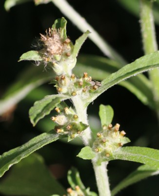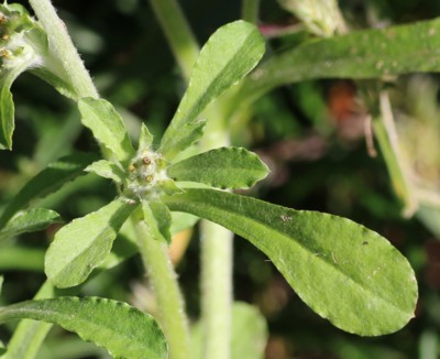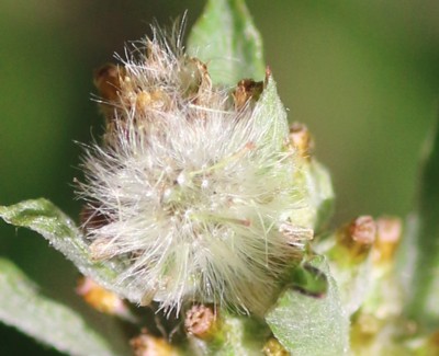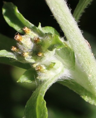 | ・茎の上部の葉腋からでた枝に小さな頭花が数個ずつかたまってつく。似た「チチコグサ」の花は茎頂につく。 |