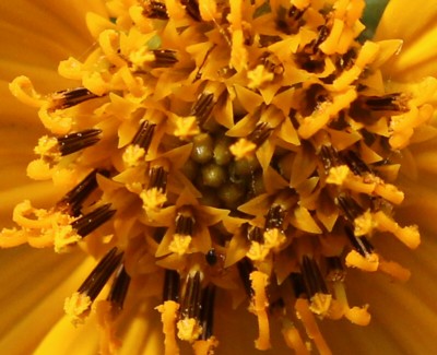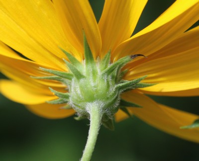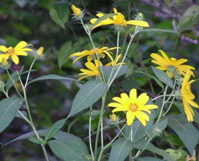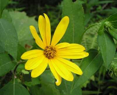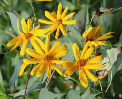 ・上部の枝先に6〜8cmの黄色の頭花を一つずつつける。内側に筒状花が多数あつまり、まわりには10〜20個の舌状花が並ぶ。