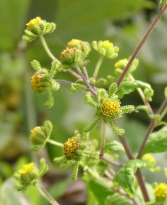 ・頭花は黄色で直径1~2㎝、まわりに舌状花があり、中心は筒状花。