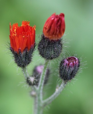 | ・頭花は直径2〜2.5pで、橙赤色の舌状花からなり、総苞片には黒っぽい毛が密生している。 |