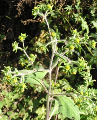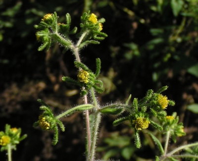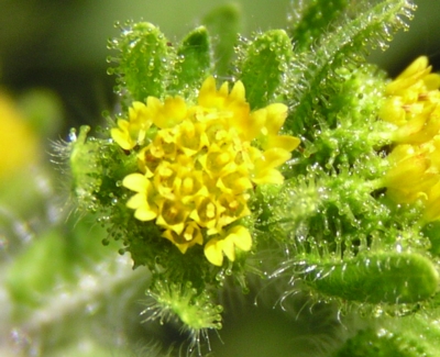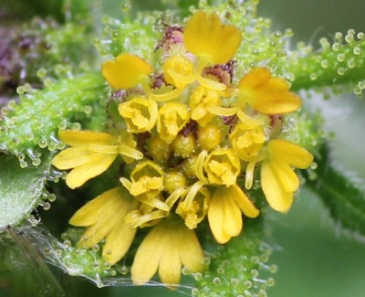 ・枝先に頭花を集まってつける。頭花は黄色で直径約2㎝、まわりに舌状花があり、中心は筒状花。総苞片は5個、腺毛が密生している。
