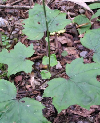 | ・葉は長い柄があり、茎の中部に輪生状につく。長さ6〜12p、幅6〜18pの腎心形または円心形で掌状に浅く裂ける。 |
