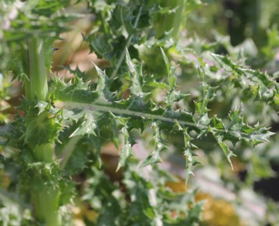・葉は長さ15〜25cmで羽状に切れ込む。縁は棘状となり触ると痛い。基部は耳状となって茎を抱く。