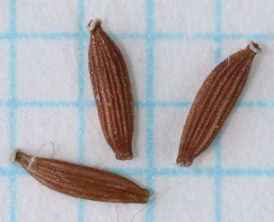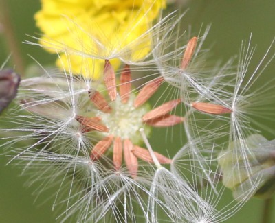 | ・そう果は円柱形で両端が細く、長さは約2mm、多数の縦の稜がある。冠毛は白色。 |