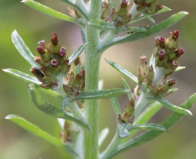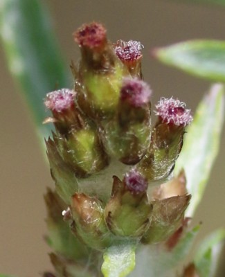 ・茎の上半部の葉の付け根に小さな頭花を多数穂状につける。