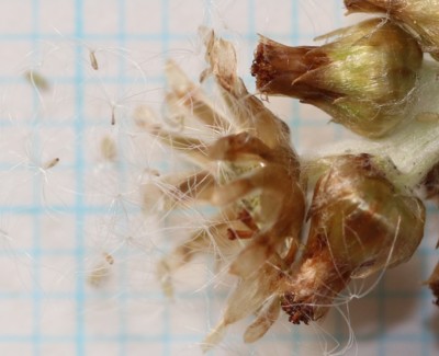 ・頭花は長さ約3mm。下部はやや太く、基部に綿毛が密生する。