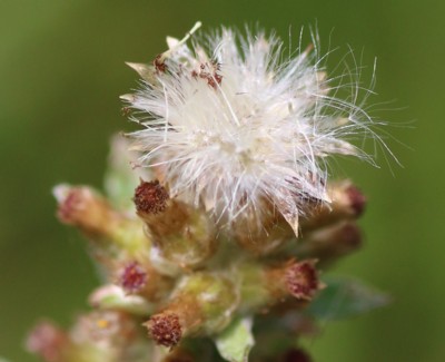 ・頭状花は長さ約5mmで茎の上部に集まってつける。筒状花は紅色。