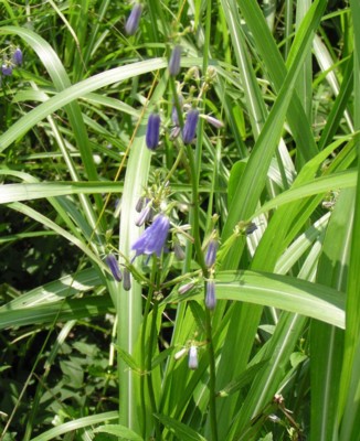 ・茎の先に円錐花序を出し、輪生状に下向きにつける。花は長さ1.5〜2cmほどの淡青紫色、または白色。