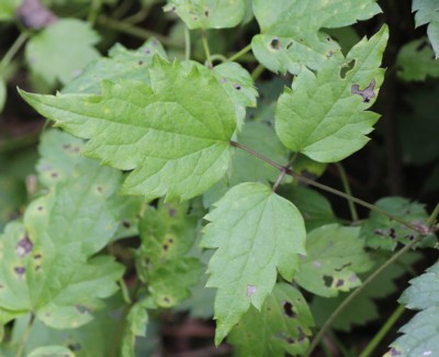 ・葉は1回3出複葉。小葉は長さ3〜5cmの広卵形で先はとがり、不ぞろいの鋸歯がある。