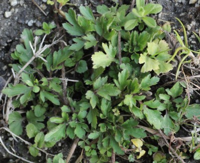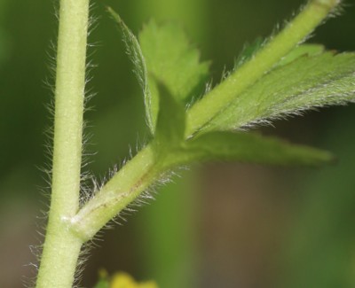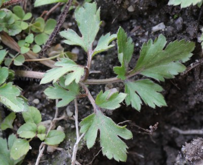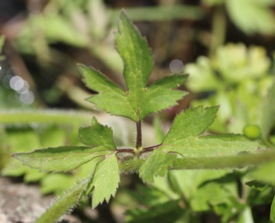 ・茎は直立し、よく枝を出す。葉は3出複葉で、小葉はさらに3裂する。全体に毛が多い。
