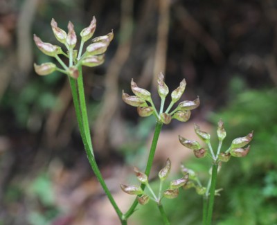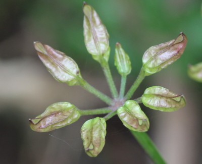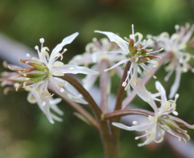 ・花茎の先に直径1cmほどの花を数個つける。花は白色〜淡ピンク色。