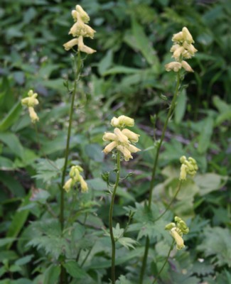 gigas」から「Aconitum umbrosum」に変わりました。北海道に分布するものとして「エゾレイジンソウ」と言うのがあり、花弁の距の違いで二つを見分けられるようですが確認してません。分布域から考えると、写真は「エゾレイジンソウ」だと思います。3つ星に変更です。 |