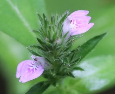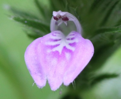 ・茎先や葉腋に花穂を出し、唇形の淡紅紫色の花をつける。萼片や苞のふちに白い毛がある。