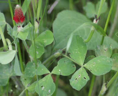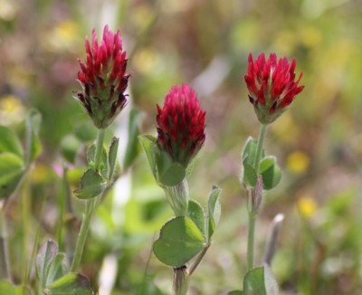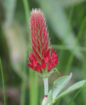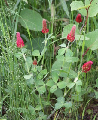 ・茎先に直径2cmほどの円柱形の花穂を出し、濃い赤色の蝶形花を多数つける。