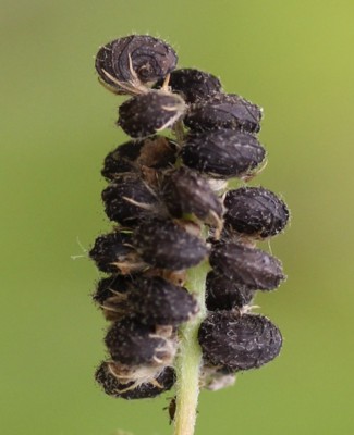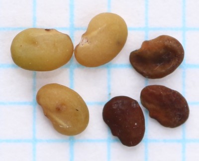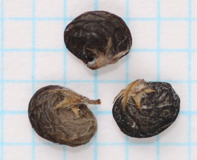 | ・豆果は長さ約2.5o、表面には渦巻き状の脈があり、先の方だけ内側に巻く。熟すと黒くなり、なかに種子が1個入っている。 |