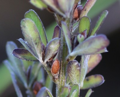 ・豆果は平たい広楕円形で先はとがる。熟すと茶褐色になる。
