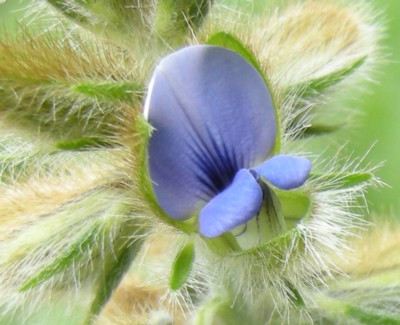 ・花は長さ約1cmで青紫色。萼は大きく、褐色の長い毛が密生して花後に豆果を包む。