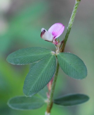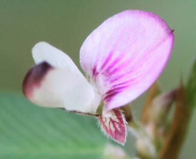 ・葉腋に1〜2個の蝶形花をつける。花は長さ約5oで淡紅紫色。