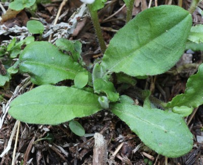 ・根生葉は長さ12〜15cm、幅2〜3cmの倒披針形で、縁はやや波打つ。