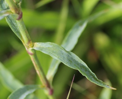・葉は対生し、長さ3〜9cm、幅4〜10mmの線状披針形で、基部は茎を抱く。