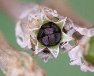 | ・果実は刮ハ。長さ6〜7mmの長楕円形。萼に包まれ、熟すと先が6裂して種子を出す。 |