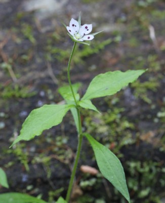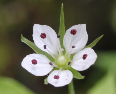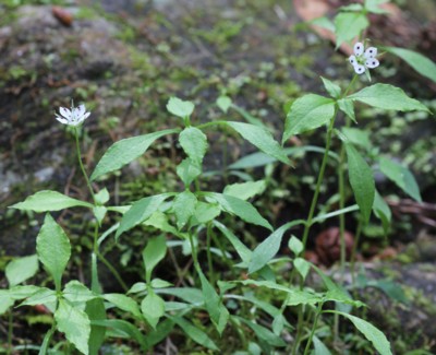 ・上部の葉腋から細い柄を出し、白色の花をつける。花弁は5個。葯は紫色。