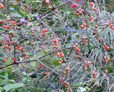 ・「ホオズキ」は、花後、袋状に大きくなった蕚に液果が包まれるが、これは液果が露出していることからこの名がある。