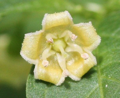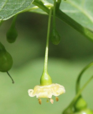 ・葉腋から2〜4個の花柄を出し、直径約8mmの淡黄色の花を下向きにつける。先は5裂し裂片は反り返る。