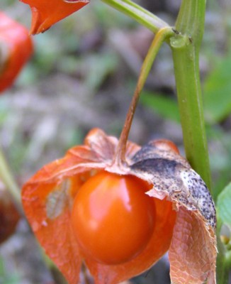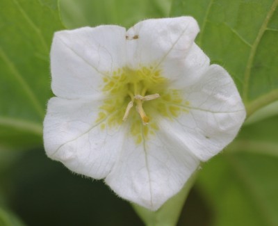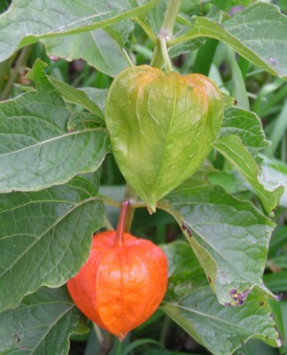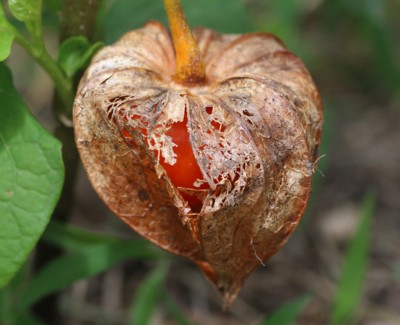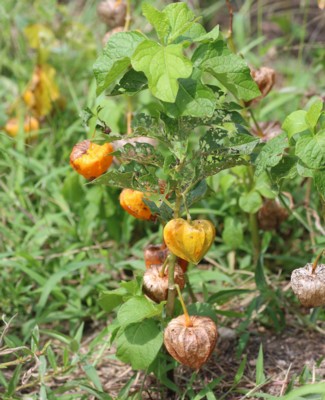 実はたまに見かけるが、花だけでは気づかない。ホオズキ属は、花後に萼が袋状になって包む。同じ仲間「センナリホオズキ」。